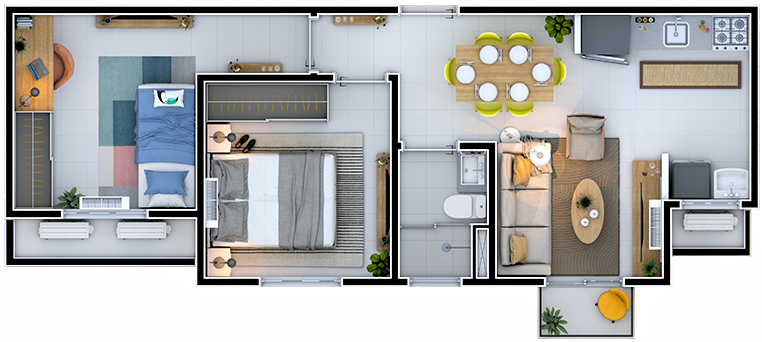 São apartamentos de 2 dormitórios, terraço ou garden, com metragens entre 45 m² e 61 m², distribuídos em diferentes tipologias para atender ao seu estilo de vida. Todos os apartamentos serão entregues com piso frio já instalado, duas áreas técnicas para a instalação de ar condicionado no living e em ambos os dormitórios, acabamentos de qualidade e ambientes bem aproveitados para que você e sua família vivam com mais conforto.